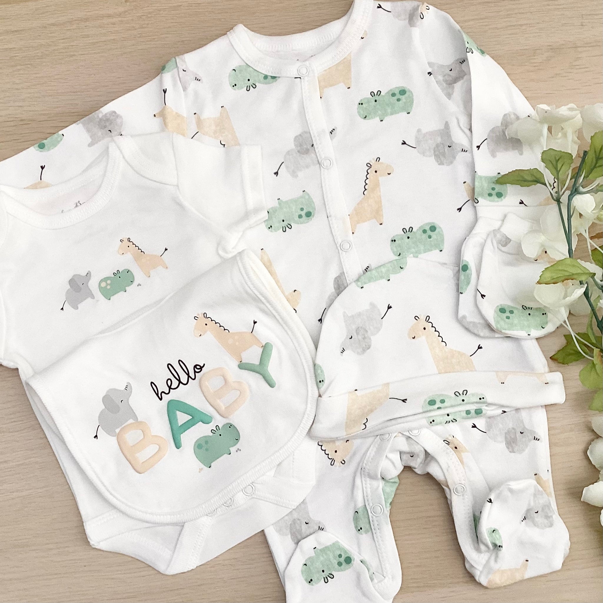 This adorable New baby gift set comes with a short sleeved vest, Babygrow, hat, mittens baby blanket and co-ordinating baby bib.
